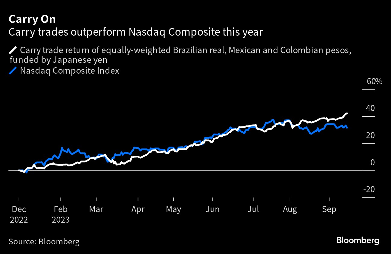 There are plenty of caveats, of course. No one is suggesting the yen carry trade is dead or that speculators abandon the yen for the yuan. So far this year, funding purchases with the yen in Latin America — where benchmark rates are as high as 13.25% — has been particularly profitable. An equal-weighted basket of reais, and Colombian and Mexican pesos has gained 42%, easily surpassing the Nasdaq's rally.
