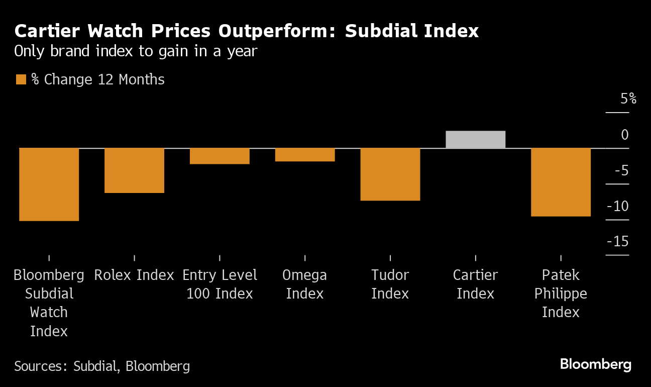 Watches made by the French jeweler, owned by Switzerland's Richemont, outperformed the 10.2% decline in the Bloomberg Subdial Watch Index over the same period. The index tracks prices for the 50 most traded watches by value on the used market. Indexes for Swiss brands including Rolex, Patek Philippe and Omega also declined.