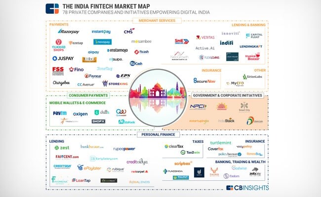 Split into merchant services, personal finance and consumer payments, and government initiatives, the CBInsights infographic covers the most prominent efforts in digitizing India's economy however this not an exhaustive list of all the players in the sector.