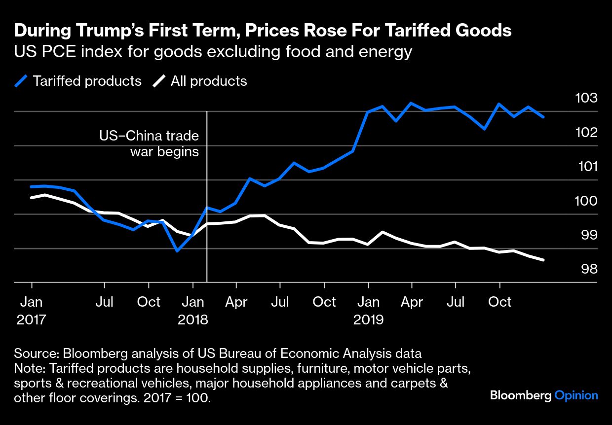 The selloff that followed this week's "hawkish cut” by the Fed revealed the extent of the anxiety. Fed Chair Jerome Powell still forecasts two cuts next year, but the market is thrown by his admission that some FOMC members are already attempting to incorporate the impact of Trump 2.0 tariffs. Such an approach is prudent, but amps up uncertainty. Are tariff concerns overblown? The Trump 1.0 tariffs in 2018 had a muted inflationary impact, but price expectations were well anchored at the time. This chart suggested by research from Oxford Economics suggests that we should be careful with that analogy. Products hit by those tariffs did indeed see markedly higher inflation: