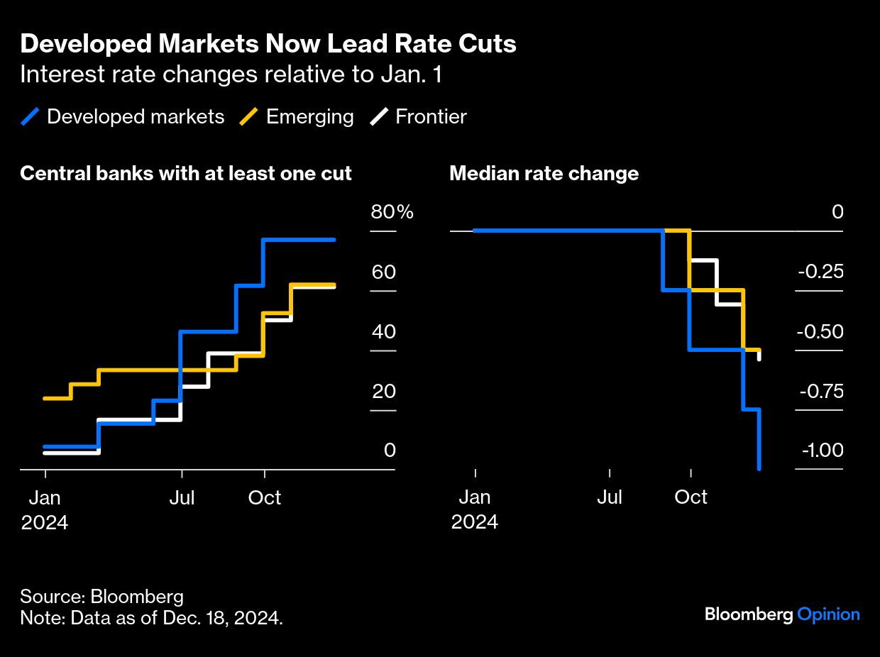 The Fed arrived late but in style with September's jumbo cut, but now faces the prospect of staying at a new plateau for a while. This is a repeating pattern. Central banks in developed markets were noticeably slower in their response to the inflation surge. As a result, the rates when they came inflicted much pain, and they had to wait before starting to cut. This year, nearly 80% of developed world central banks eased policy with the most notable exceptions being Japan — which exited the negative interest rates policy (NIRP) it had had in place since 2016 — and Norway and Australia, which held steady throughout the year.