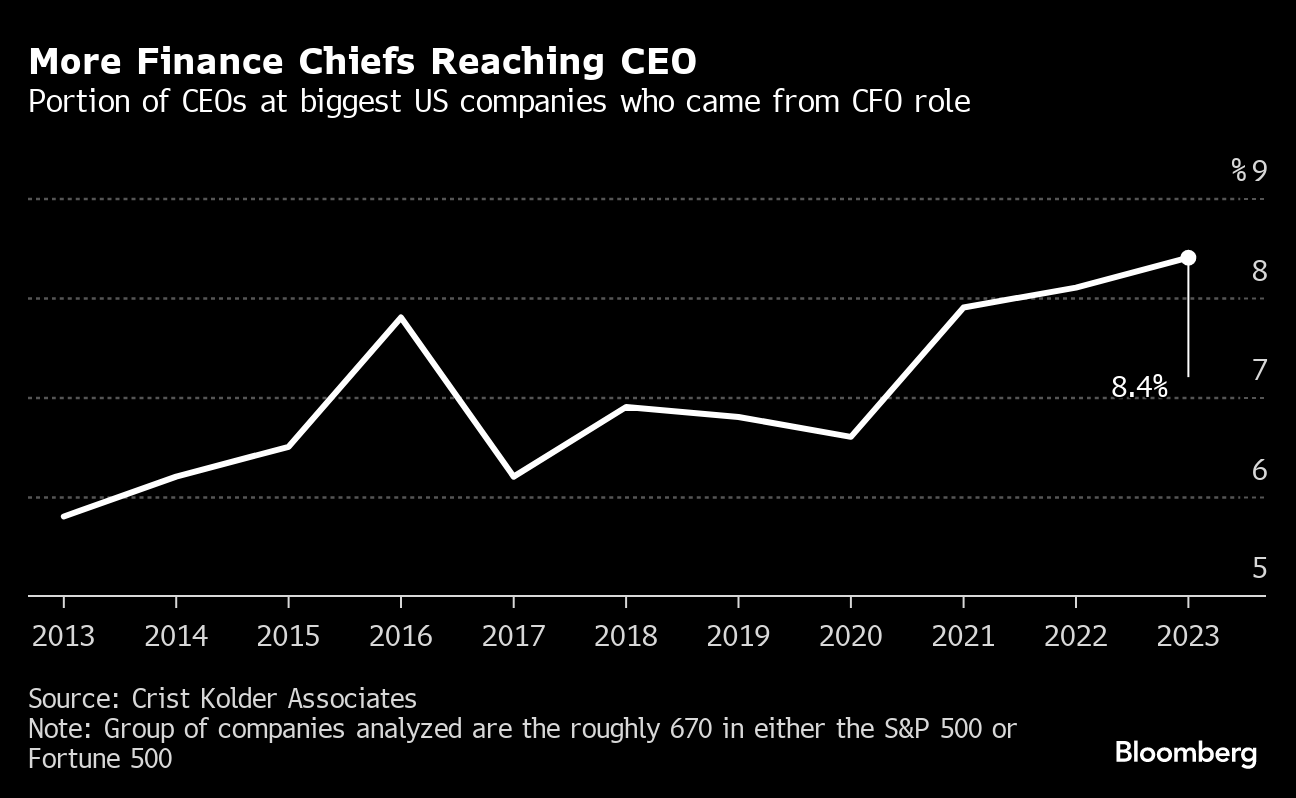 CFOs have historically been known for number crunching, but they are increasingly taking on more operational responsibilities. That helped a record number of finance chiefs ascend to the top job last year at America's biggest companies. Among the firms represented in the S&P 500 and Fortune 500, 8.4% of them promoted a finance chief to CEO, according to exclusive data from Crist Kolder Associates, an executive search firm. That's up from 5.8% a decade ago.