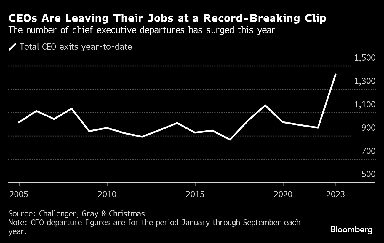 More than 1,400 chief executives have left their positions so far this year through September, according to a report by executive coaching firm Challenger, Gray & Christmas, Inc. That's up almost 50% from the same period last year and the highest on record over that period since the firm began tracking in 2002.
