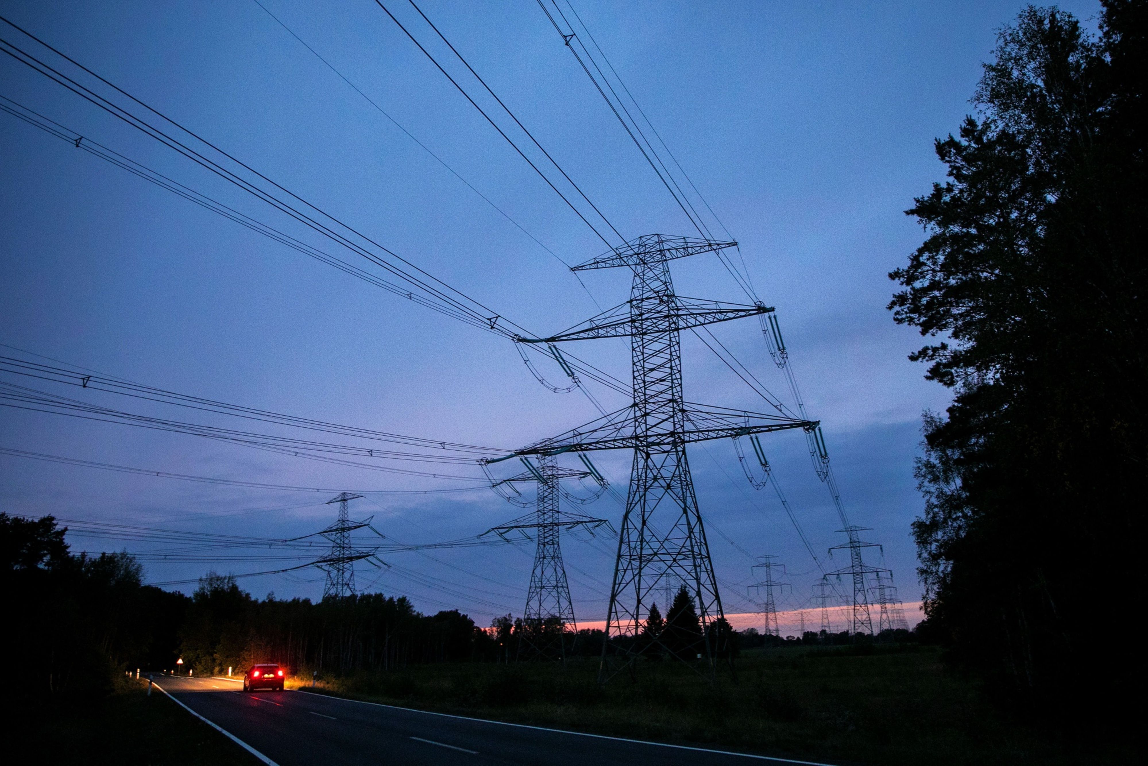 A car drives along a road at dusk and passes electrical power lines hanging from transmission pylons. (Photographer: Krisztian Bocsi/Bloomberg)