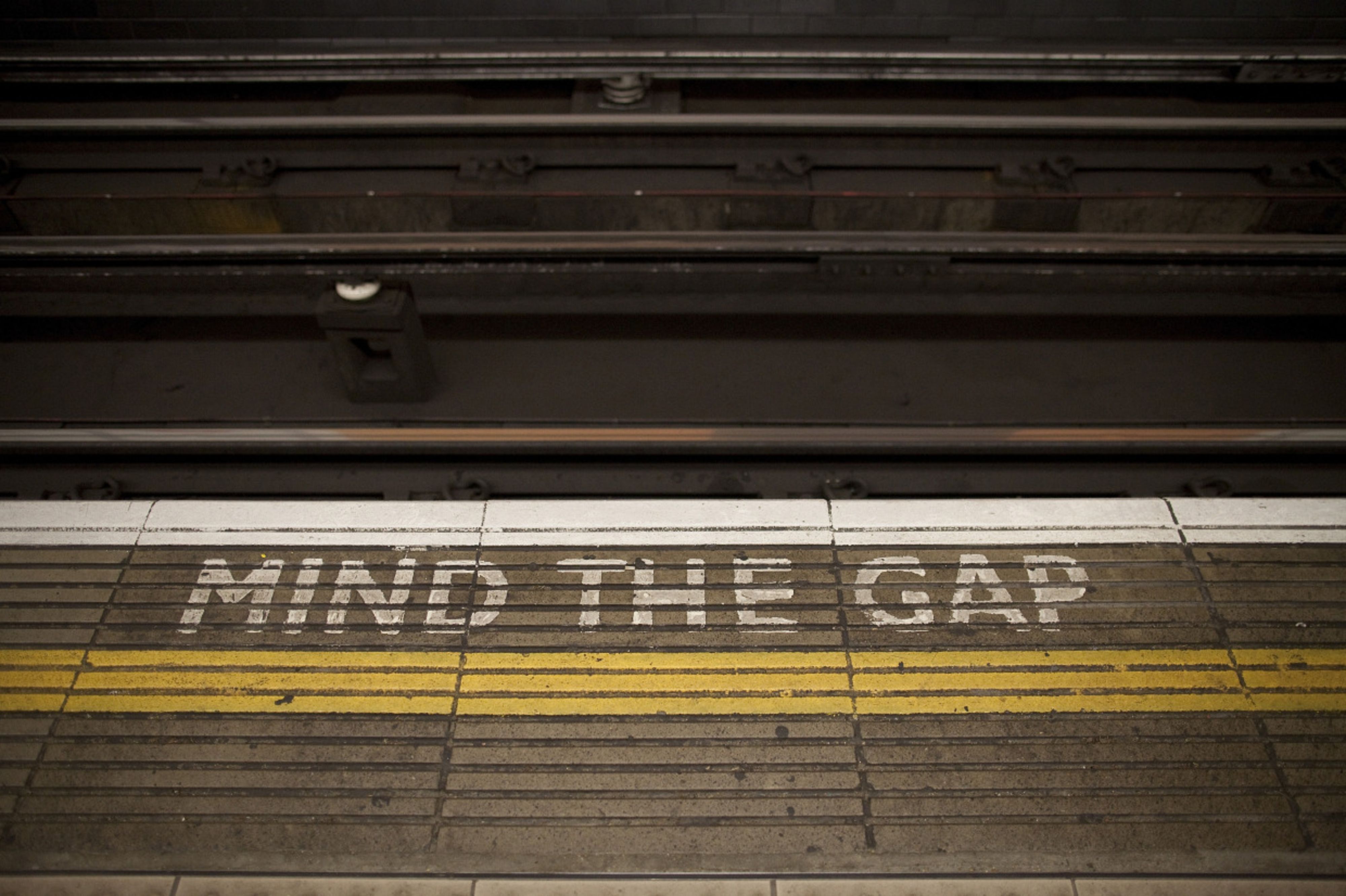 A ‘’Mind the gap’’ sign is seen on a platform’s edge at London Underground’s Bank tube station in London, U.K., on Thursday, June 7, 2012.Photographer: Simon Dawson/Bloomberg