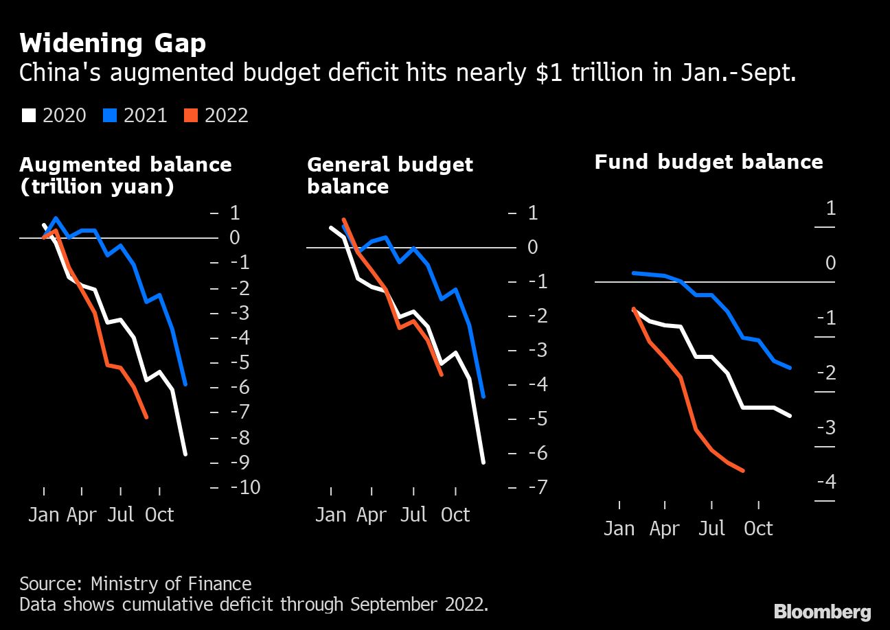 China's broad fiscal deficit hit an all-time high in the first nine months of the year as Covid outbreaks and a housing market slump continue to erode government income. The deficit in the budgets for all levels of government was 7.16 trillion yuan ($980 billion), according to Bloomberg calculations based on data released by the Ministry of Finance on Tuesday.