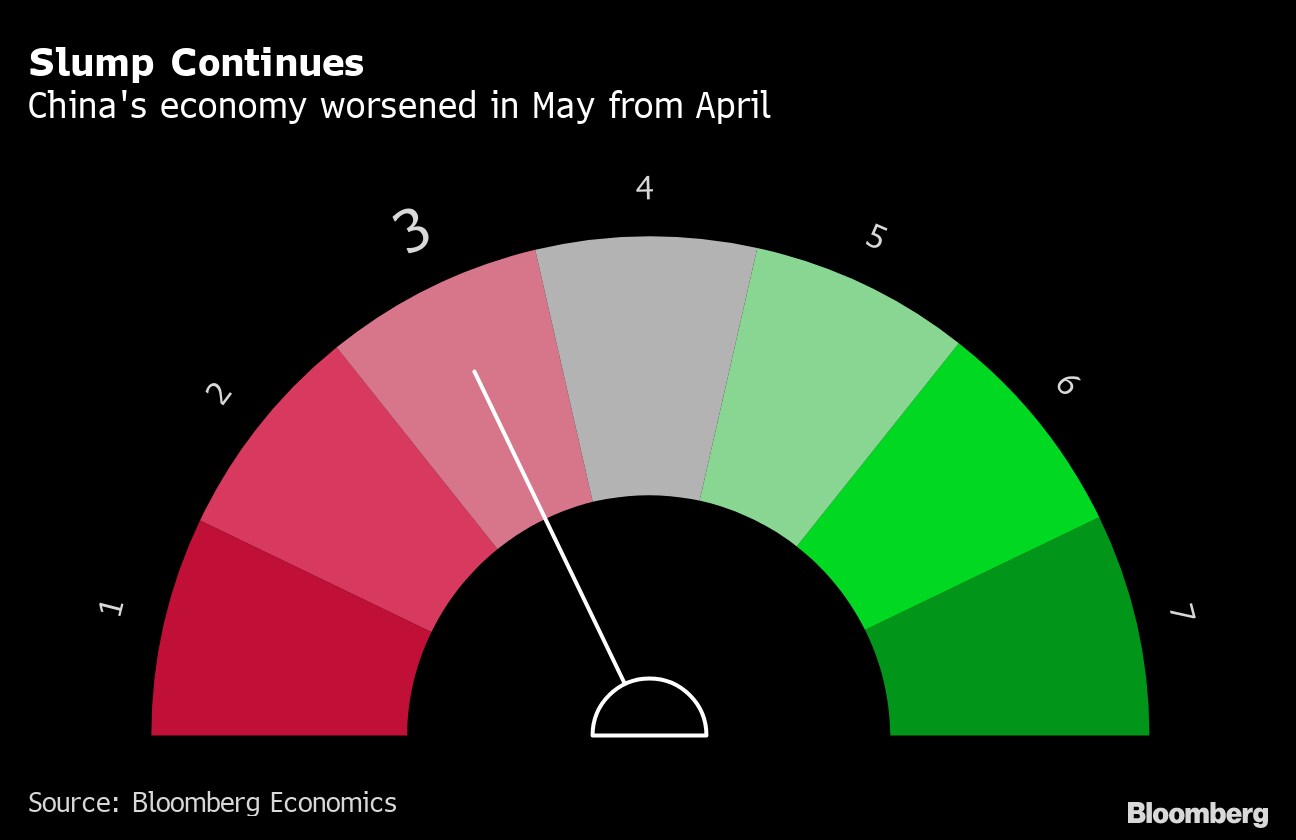 China's economy remained deep in a slump in May as lockdowns continued to weigh on activity, and as the threat of omicron and expanded restrictions dampened sentiment. That's the outlook based on Bloomberg's aggregate index of eight early indicators for this month.