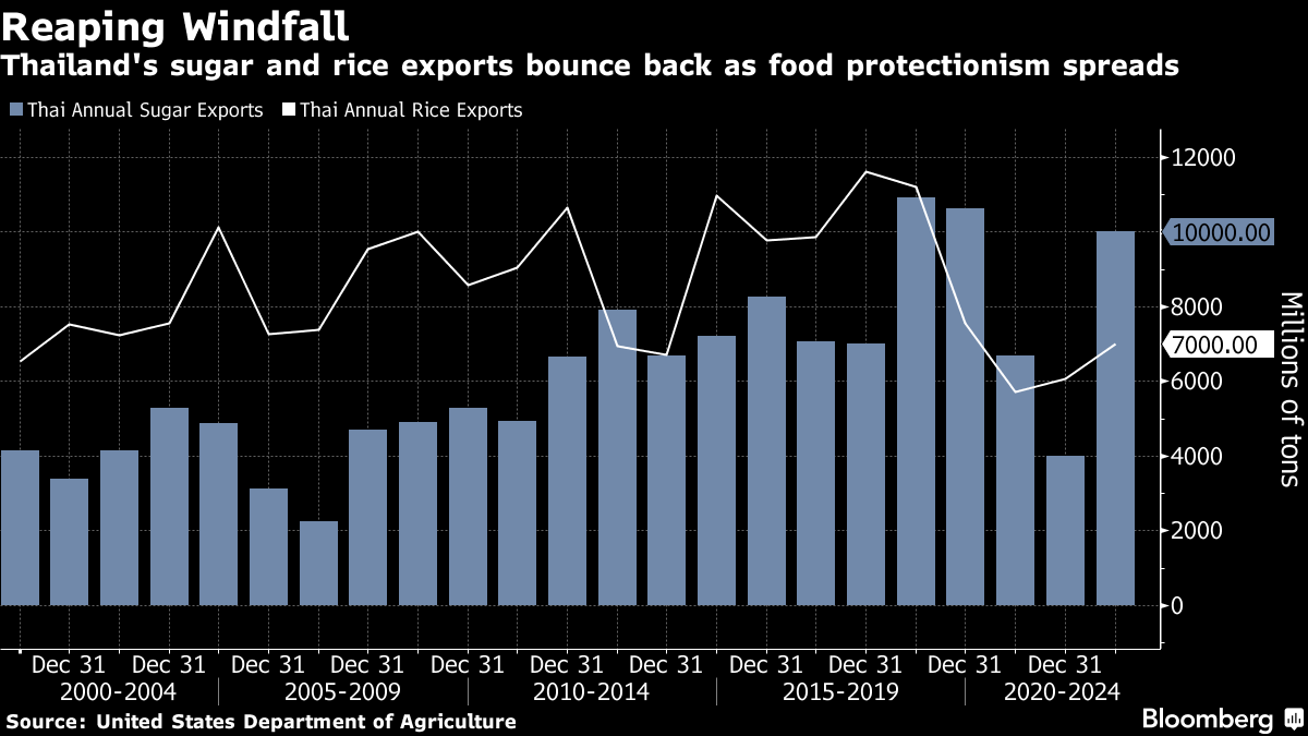 Thailand -- a major exporter of sugar, chickens and rice -- looks set to benefit as many of its Asian neighbors limit shipments of agricultural commodities to shelter consumers from surging prices. The rising food protectionism and price rallies are welcome news for Thai producers that are enjoying strong harvests this year after back-to-back droughts.