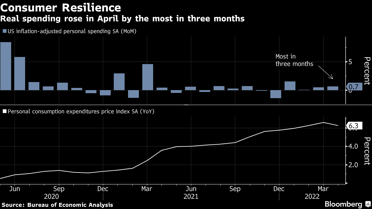 In the US, consumer spending held up well despite decades-high inflation, and showed more evidence that they're dipping into their savings to support purchases. China's economy remained deep in a slump in May as lockdowns continued to weigh on activity.