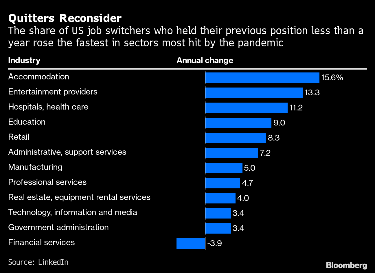 More Americans are quitting their jobs than ever, and fewer are sticking around in their new positions. Among workers who took a new job in 2021, the share who had been in their previous position for less than 12 months rose by 6.5% compared with a year earlier, data compiled by LinkedIn show.