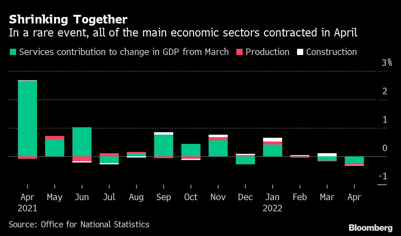 The UK economy shrank in April at the sharpest pace in more than a year, highlighting risks that a broader contraction is under way. The figures underscore a dimming outlook for the economy, with manufacturing, services and construction all contracting together for the first time since January 2021.