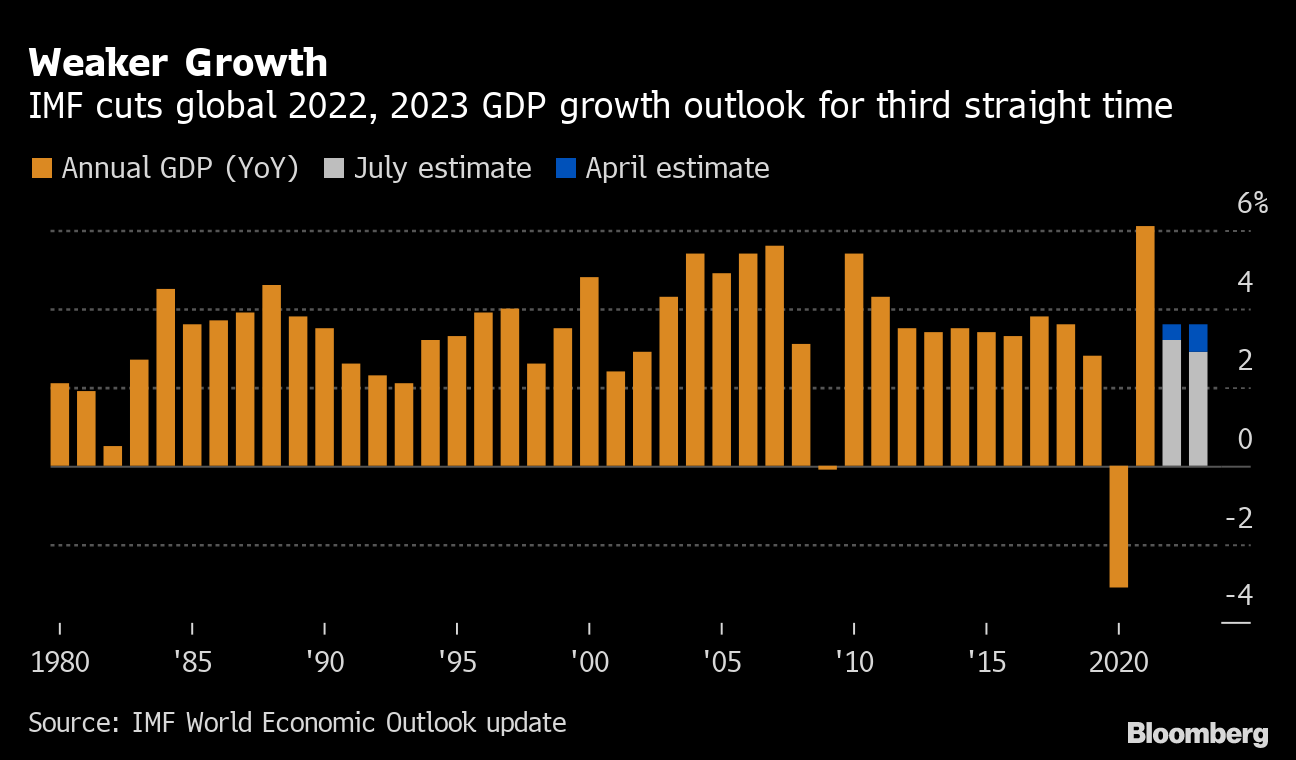 The IMF cut its global growth outlook for this year and next, warning that the world economy may soon be on the cusp of an outright recession. Global economic expansion will likely slow to 3.2% this year, less than the 3.6% forecast by the fund in April and the 4.4% seen in January.