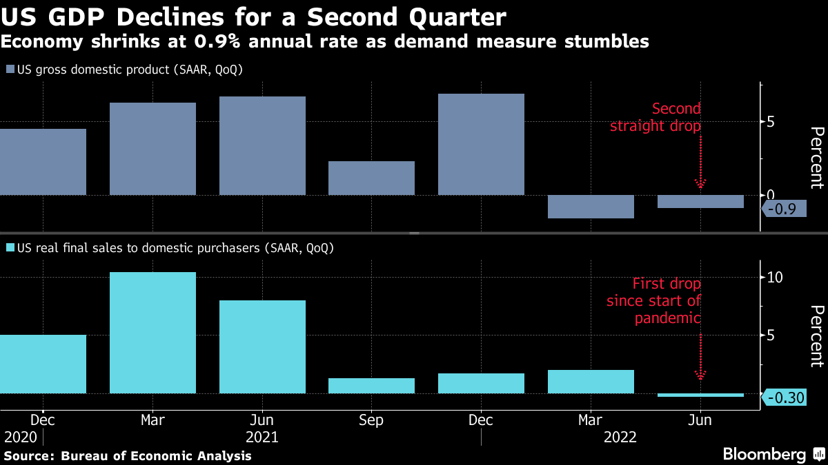 The drumbeat of recession grew louder after the economy shrank for a second-straight quarter, as decades-high inflation undercut consumer spending and Federal Reserve interest-rate hikes stymied businesses and housing.