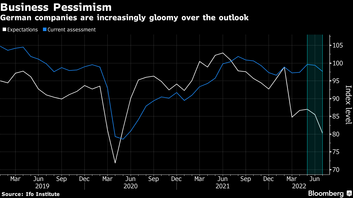 German business confidence deteriorated to the worst level since the early months of the pandemic on growing concerns that record inflation and limited energy supplies from Russia will throw Europe's biggest economy into a downturn.