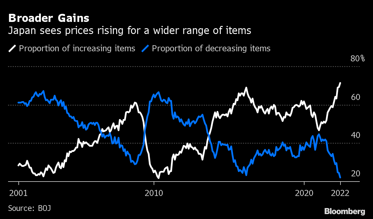 Japan's prices are showing more signs of rising on a wider basis as soaring commodity prices and a weak yen force companies to pass higher costs to consumers at a pace not seen in decades. Multiple gauges of the deeper inflation trend hit record highs in June.