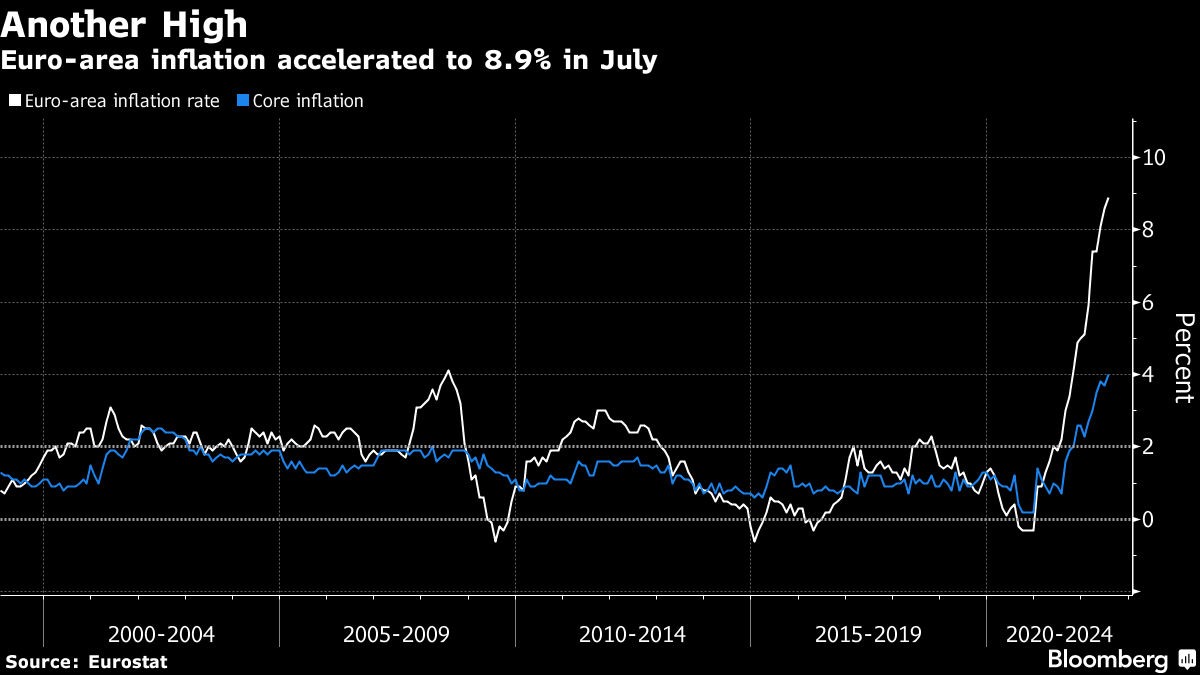 Euro-zone inflation climbed to another all-time high, supporting calls for the European Central Bank to follow up its first interest-rate hike since 2011 with another big move. Consumer prices jumped 8.9% from a year earlier in July -- up from 8.6% last month and driven once again by soaring energy and food costs.