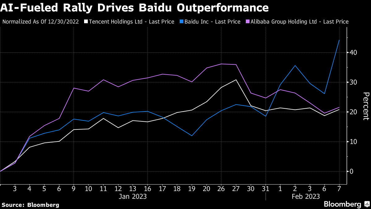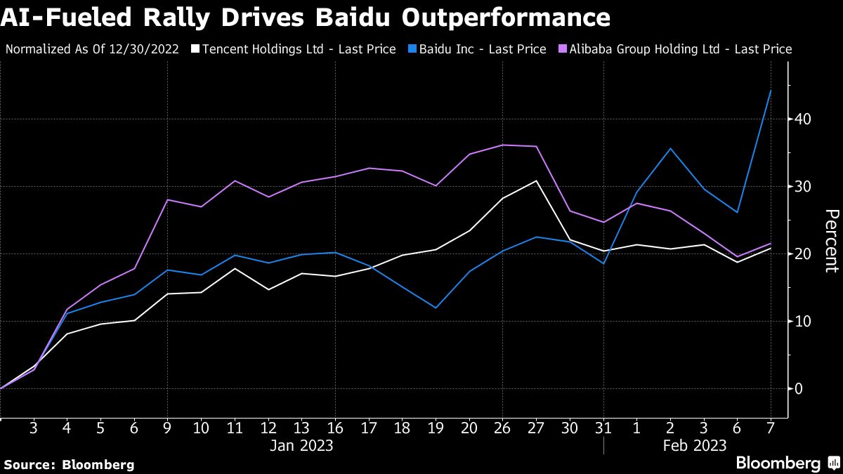 The stock has jumped 45% in Hong Kong this year, including a 15% gain Tuesday after China's largest search engine said it will unveil its artificial intelligence chatbot in March. The move, potentially the nation's most prominent entry into the next big thing, has pushed Baidu shares into overbought territory, with gains trouncing rivals Alibaba Group Holding Ltd. and Tencent Holdings Ltd.