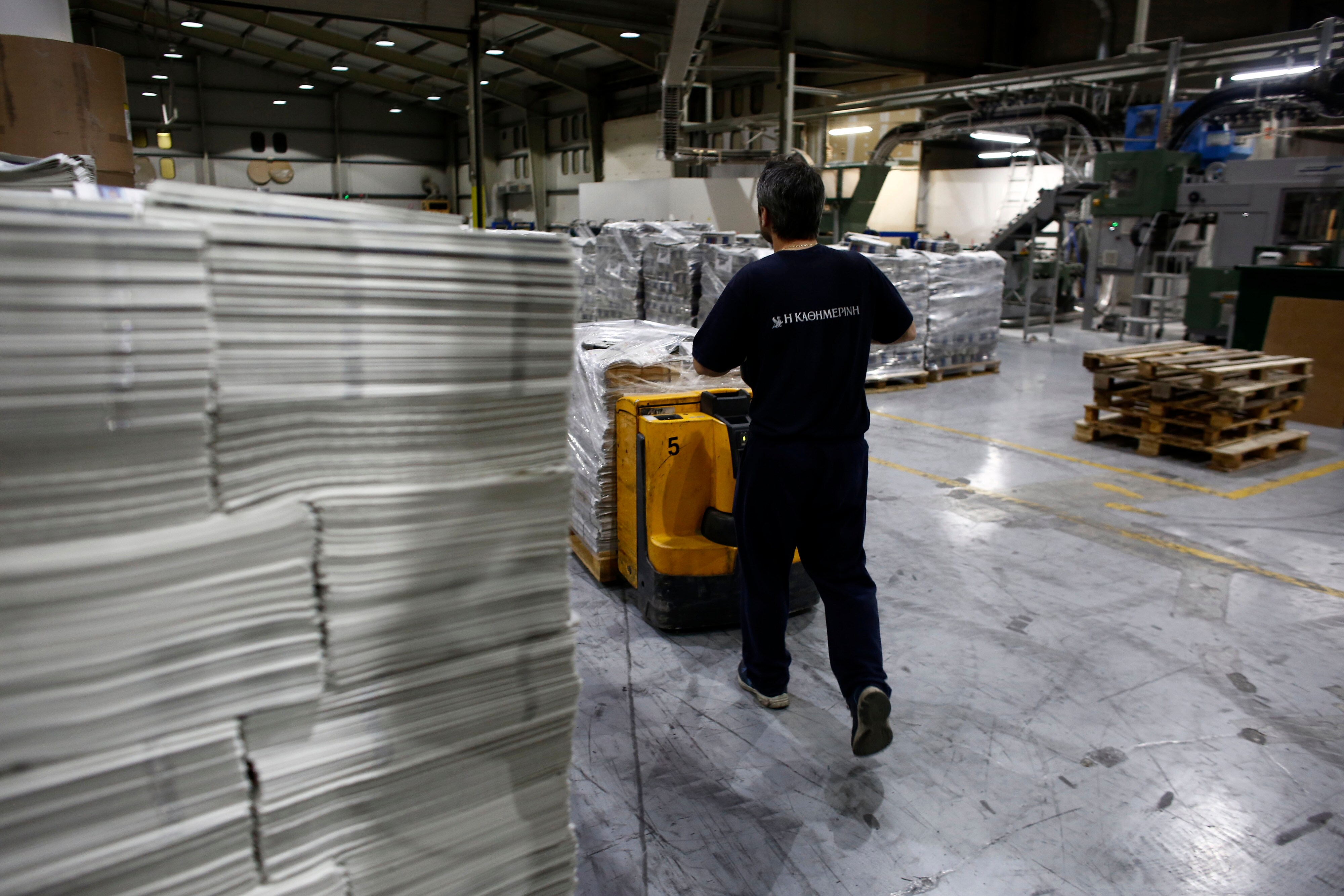 A print worker pushes a trolley past stores of printing paper rolls at a plant. (Photographer: Kostas Tsironis/Bloomberg)
