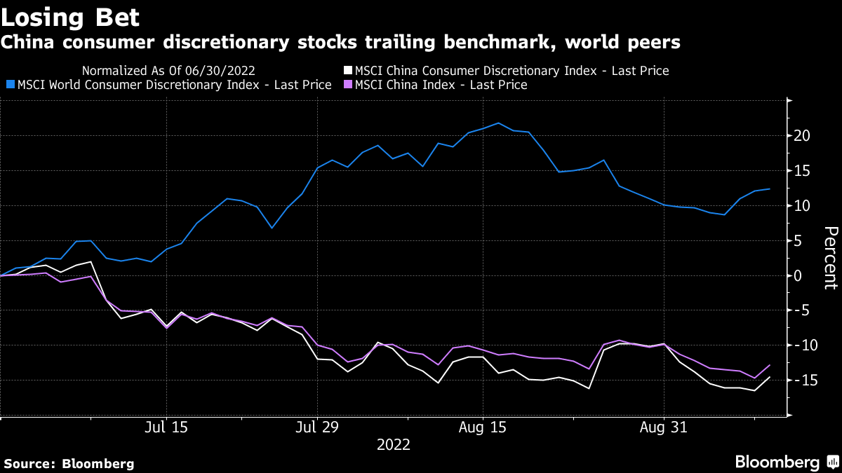 The MSCI China's sub-index on consumer discretionary stocks has fallen more than 14% this quarter, trailing the benchmark's 12.6% loss. Among the worst performers are Pop Mart International Group Ltd. -- a high-end toy retailer -- falling more than 50%, and luxury car dealer Zhongsheng Group Holdings Ltd., down more than a third.