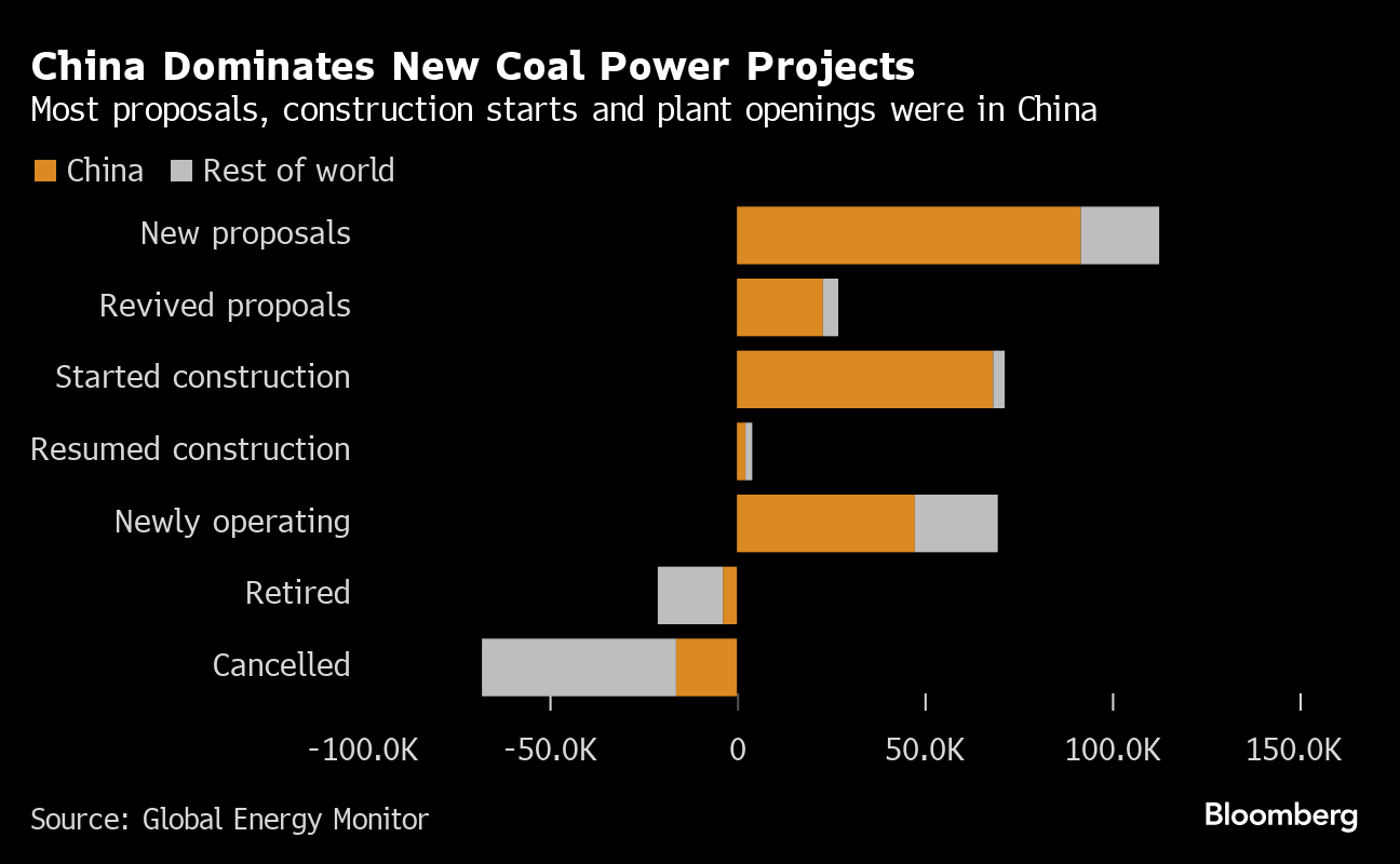 (Bloomberg) -- China was home to the vast majority of the world's new coal power plants last year as it sought to bolster energy security, even as many other governments push to phase out the fuel.