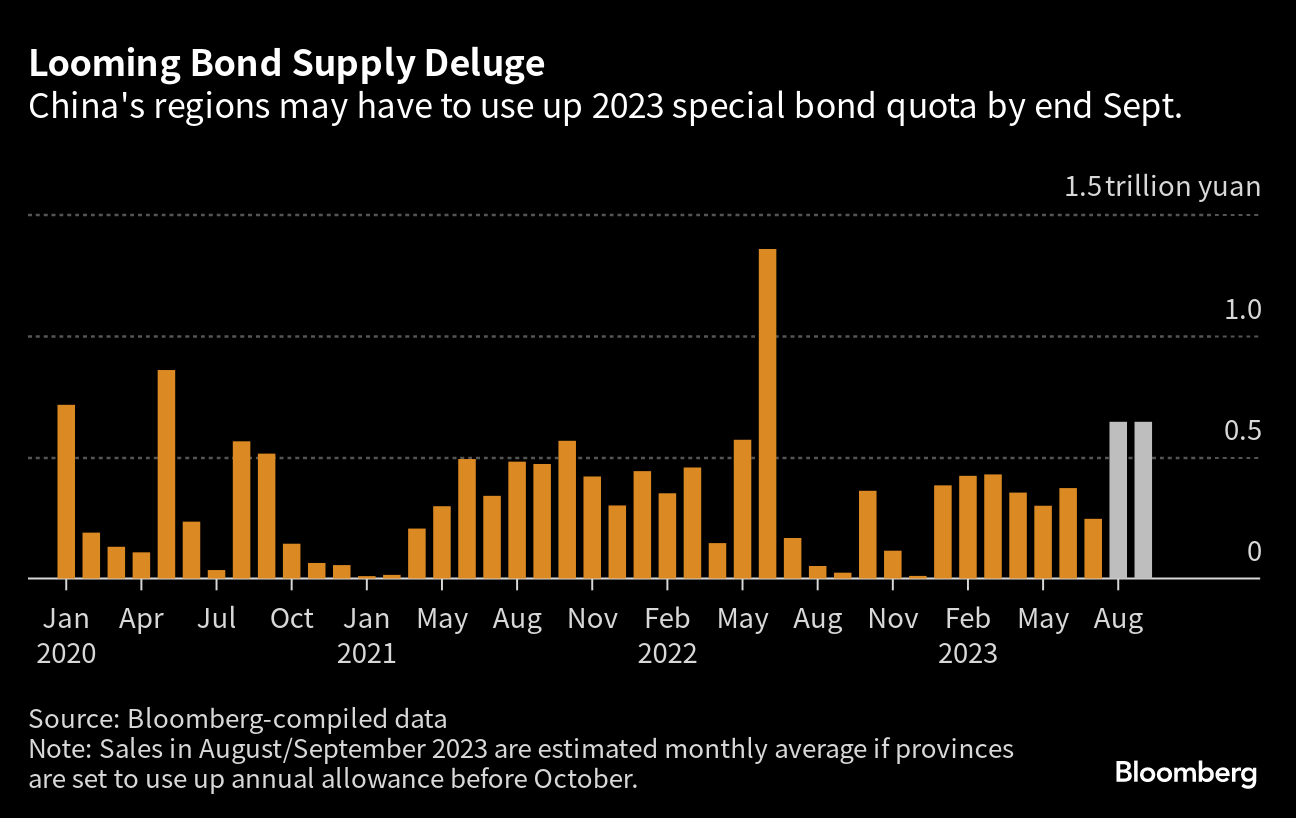 A total of 2.36 trillion yuan ($329 billion) of this year's new special bonds, which are mainly used for infrastructure spending, was sold as of the end of July. That implies an average of 670 billion yuan of the bonds will hit the market in the next couple of months to meet the September deadline, according to the report.