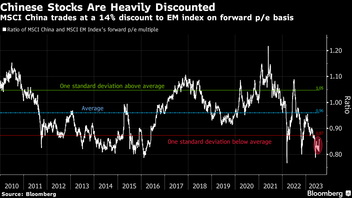 Priced at less than 11 times forward one-year earnings, the MSCI China Index is below its five-year average multiple of over 12 times. It's valued at a 14% discount versus the MSCI Emerging Markets Index, compared with the average 4% discount since 2010.