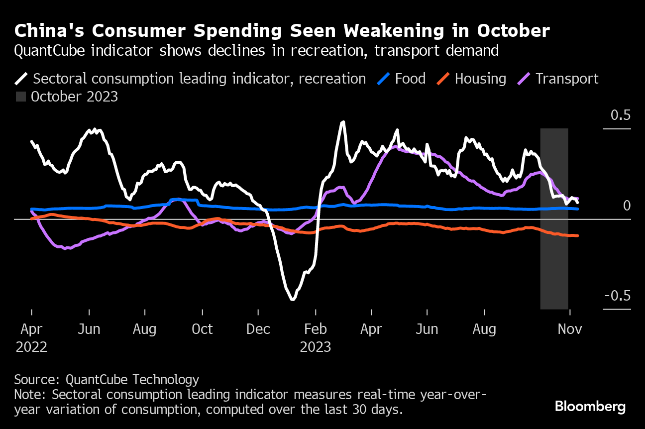 The outlook for consumption is especially important, as it has been the main contributor to demand growth in the economy this year, according to official statistics. October began with the eight-day Golden Week national holiday, where tourist spending per person remained below pre-pandemic levels.