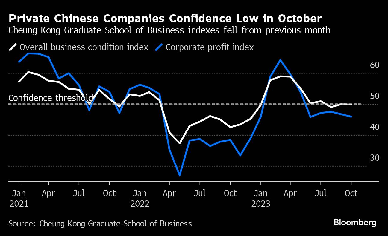 In addition, an index of private sector business conditions by CKGSB in Beijing fell slightly in October from the previous month and remained below the threshold indicating confidence. The survey covers privately owned companies that are generally relatively successful within their sectors.