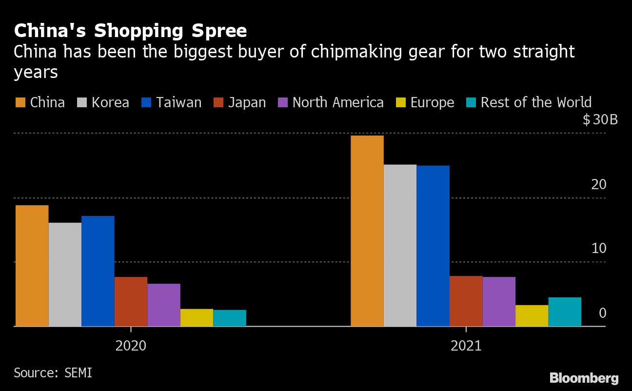 That dilemma is evident in the latest industry figures for 2021. Even in a year when worldwide bookings for equipment from the likes of US-based Applied Materials Inc. and Japan's Tokyo Electron Ltd. climbed 44% — fueled by a global surge in chip demand — the growth of China's chipmaking industry far outpaced other regions.