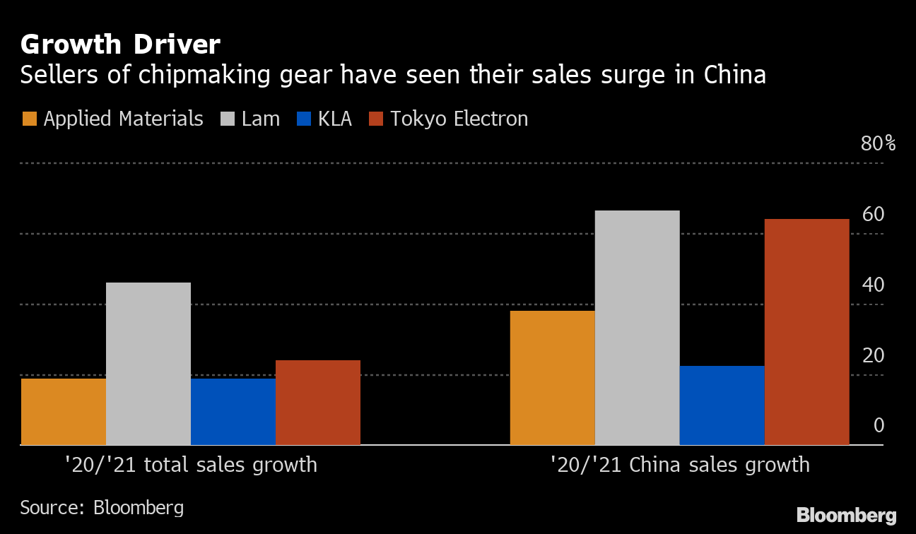 All the same, apart from ASML — whose extreme ultraviolet lithography machines are necessary to make the most advanced chips — all of the equipment makers saw sales in China outpace overall growth in 2021. Tokyo Electron reported the strongest China expansion, with sales from that market increasing more than twice as fast as its overall rate.