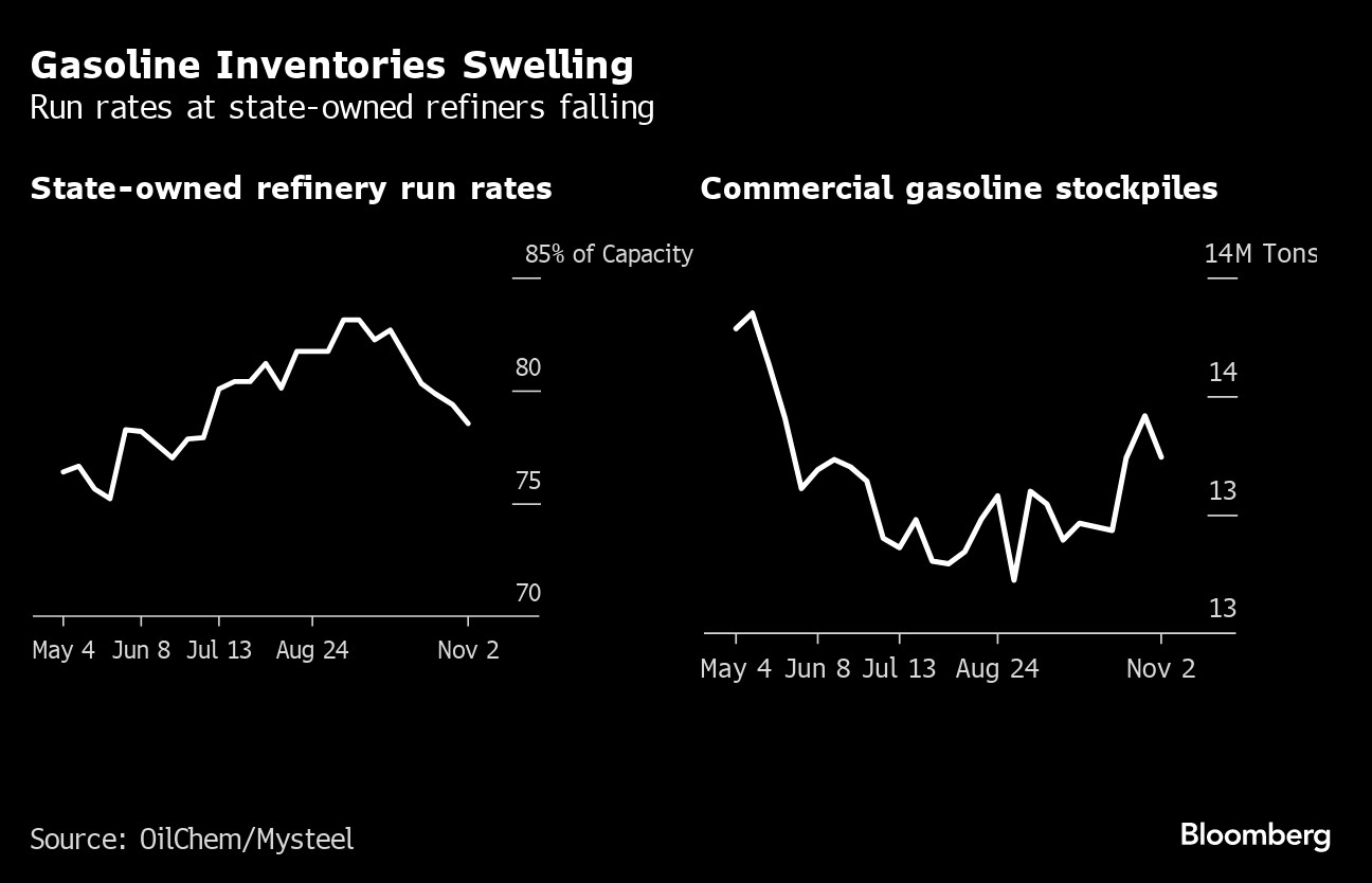 China's commercial gasoline inventories rose in the three weeks through Oct. 26, while run rates at state-owned refiners have fallen, OilChem data show. The high stockpiles and a lack of export quota are likely to lead to more declines in activity at processors, the industry consultant said. Chinese gasoline demand will peak this year due to the rapid adoption of electric vehicles, oil major Sinopec predicted in August.