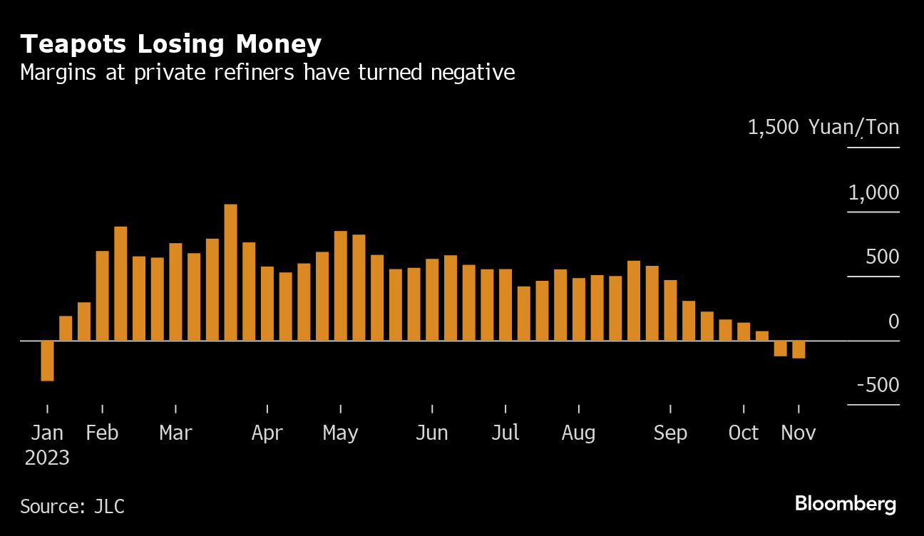 Higher crude prices and weakening demand for diesel and gasoline have hit profitability at China's independent refiners over the past couple of months. Margins at the plants known as teapots, which account for about a quarter of the country's processing capacity, turned negative in late October for the first time since early January, according to local industry consultant JLC. Run rates at facilities in Shandong province, where most of the teapots are located, were around 57% of capacity in the week through Nov. 3, the lowest since May 2022, OilChem data show.