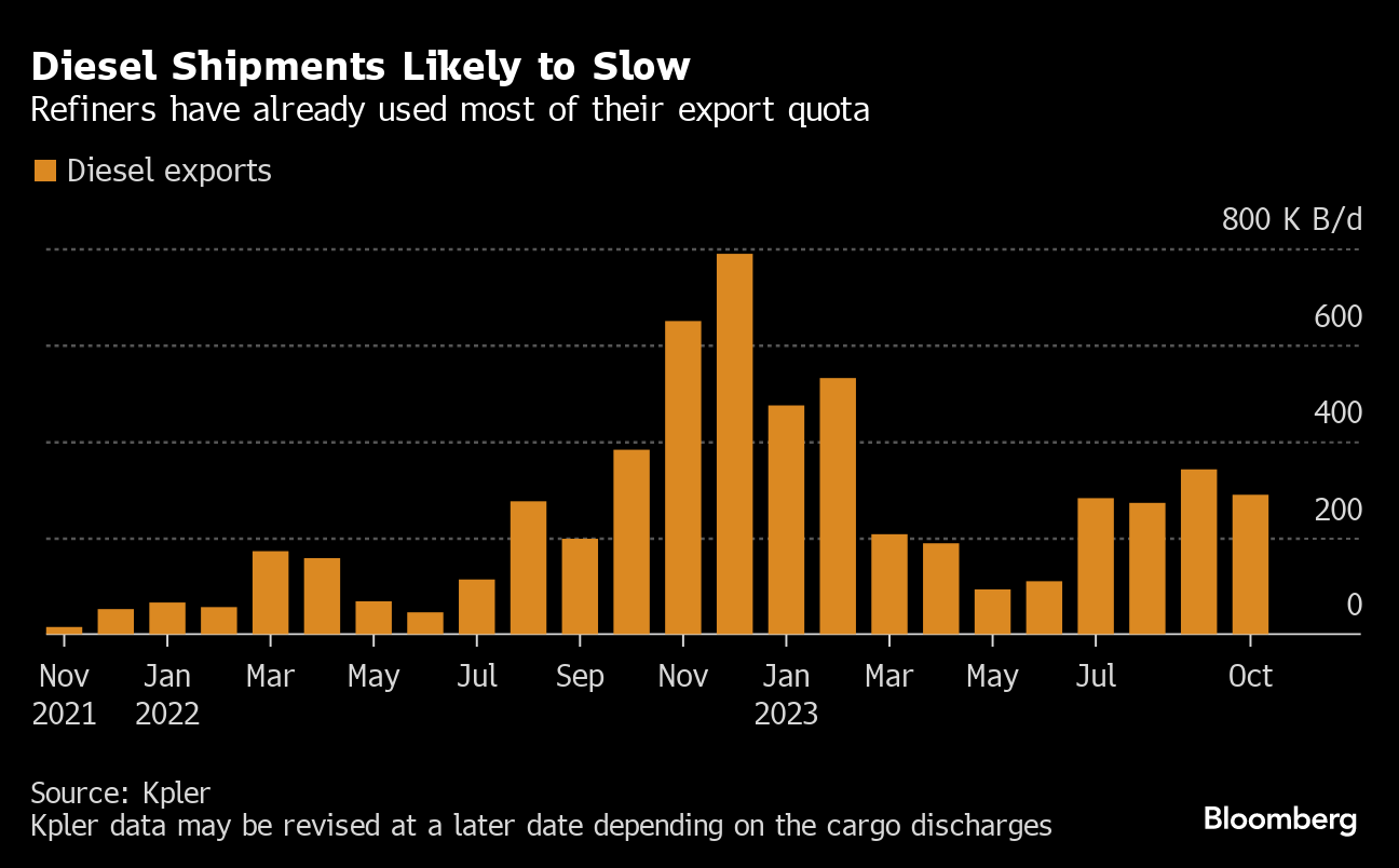 China's oil-product exports will plunge by 40% in November from October, according to OilChem. Refiners have already used up most of their fuel export quotas for 2023, and the government told them in late September not to expect any more this year. That will likely lead to a major drop in diesel shipments, which account for most of the country's overseas fuel sales, in the last couple of months of the year.