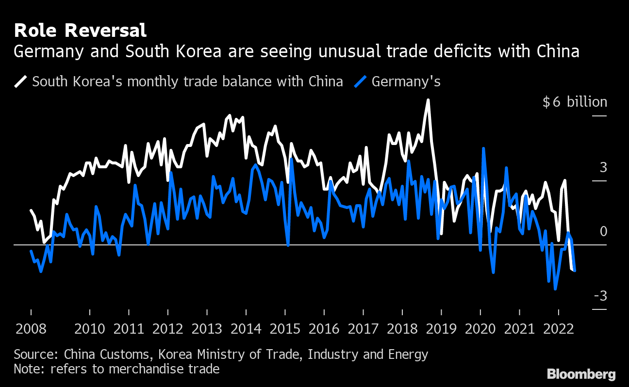 (Bloomberg) -- China's economic slowdown is spilling over to major exporting nations in Europe and East Asia through falling demand for manufactured goods, causing Germany and South Korea to post rare deficits with the world's second-largest economy.
