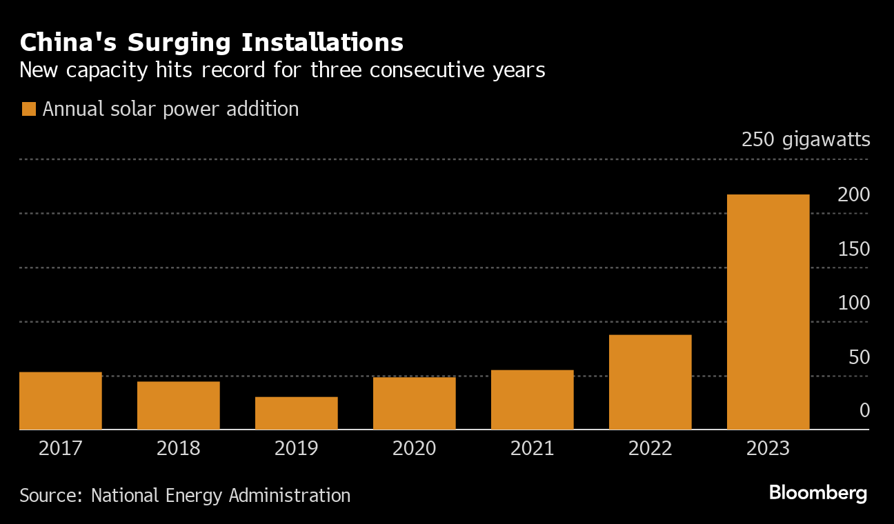 (Bloomberg) -- China's solar industry is likely to set lower expansion targets in 2024, as financial stresses and grid constraints make it challenging to match last year's explosive growth.