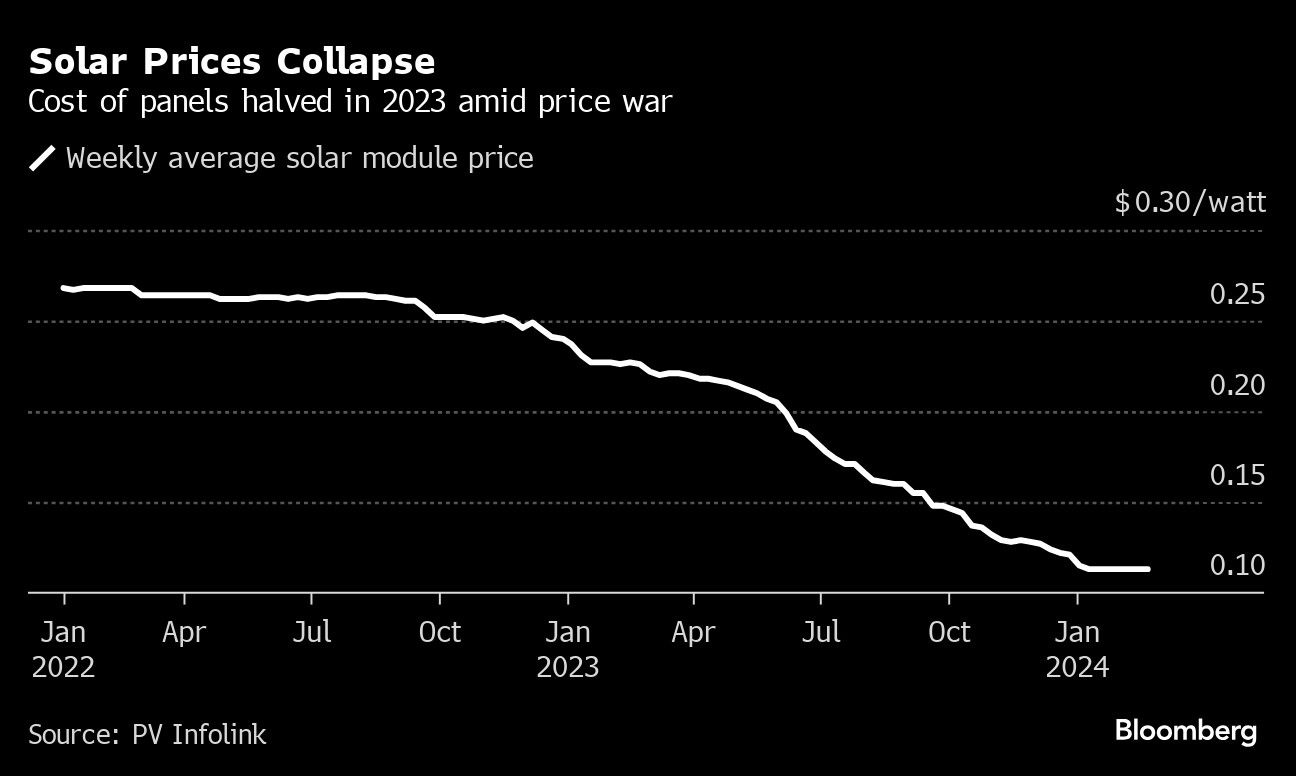 The industry is now being forced to reckon with the consequences. Excess capacity and intense competition have driven panel prices to record lows. The average price of polysilicon, a key raw material, fell 74% last year, according to BNEF.