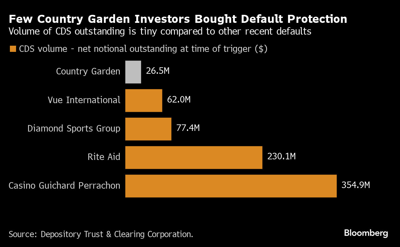 That's because China's CDS market is much less developed than in most major economies, meaning that many of the investors that bought Country Garden Holdings Ltd's $10 billion of dollar bonds did so without hedging against default. The outstanding volume of swaps is so minuscule that the panel of dealers and investors which oversees the global CDS market ruled this week that it isn't worth holding an auction to determine the size of a payout. Contracts will be settled bilaterally between buyers and sellers instead.