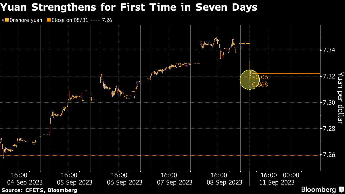 (Bloomberg) -- The yuan climbed from a 16-year low as China started the week on the offense, sending another forceful signal with the reference rate for the managed currency and urging state banks to support it.