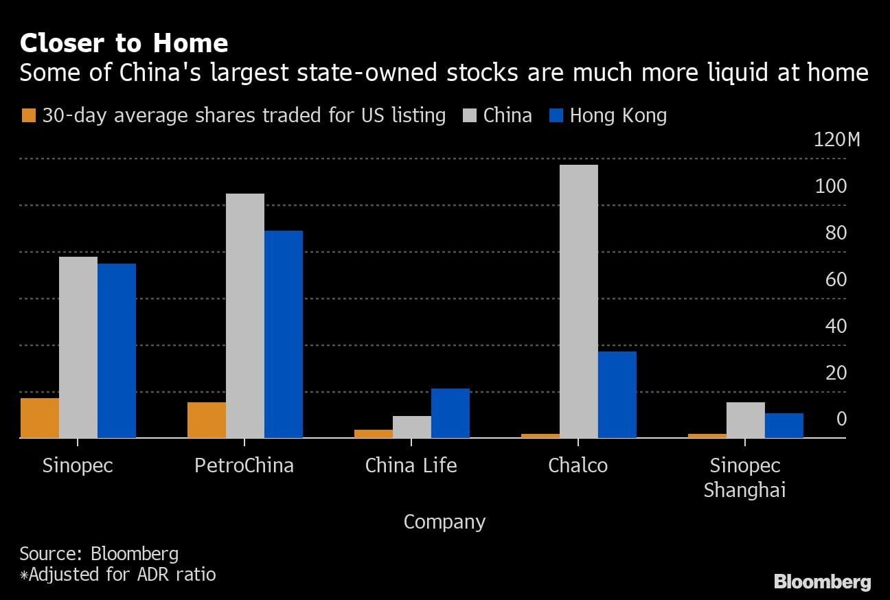 (Bloomberg) -- China's state-owned enterprises that plan to delist from US stock exchanges slid on Monday, as investors expected more firms to follow suit amid an auditing spat between the two nations.