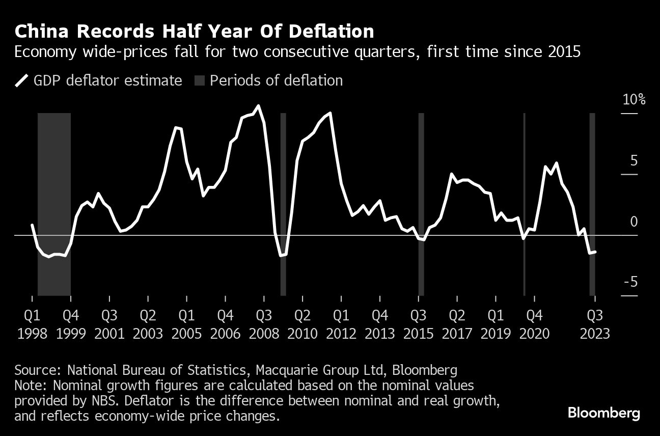 In a warning sign of weak demand stemming from the property crisis and falling exports, China's deflator — an economy wide measure of prices — was negative for a second consecutive quarter. That's the first time that's occurred since 2015, according to Bloomberg calculations based on official data.