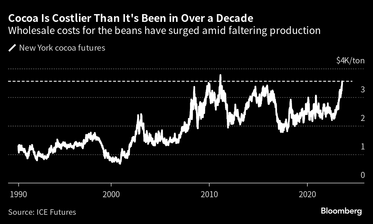 The cost of wholesale cocoa beans soared to the highest level in more than a decade, and manufacturers are betting prices of the key chocolate ingredient will stay elevated through 2024. That's mainly because production in West Africa, a region that accounts for two-thirds of the world's bean harvest, is faltering.