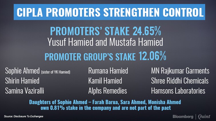 Hamied and his brother Mustafa Khwaja Hamied own 24.65 percent stake in the company, according to the filing on Wednesday. The rest of the promoter group owns 12.06 percent. Daughters of Hamied's sister Sophie Ahmed – Farah Barua, Sara Ahmed, Monisha Ahmed – own 0.81 percent stake in the company and are not part of the shareholder agreement.
