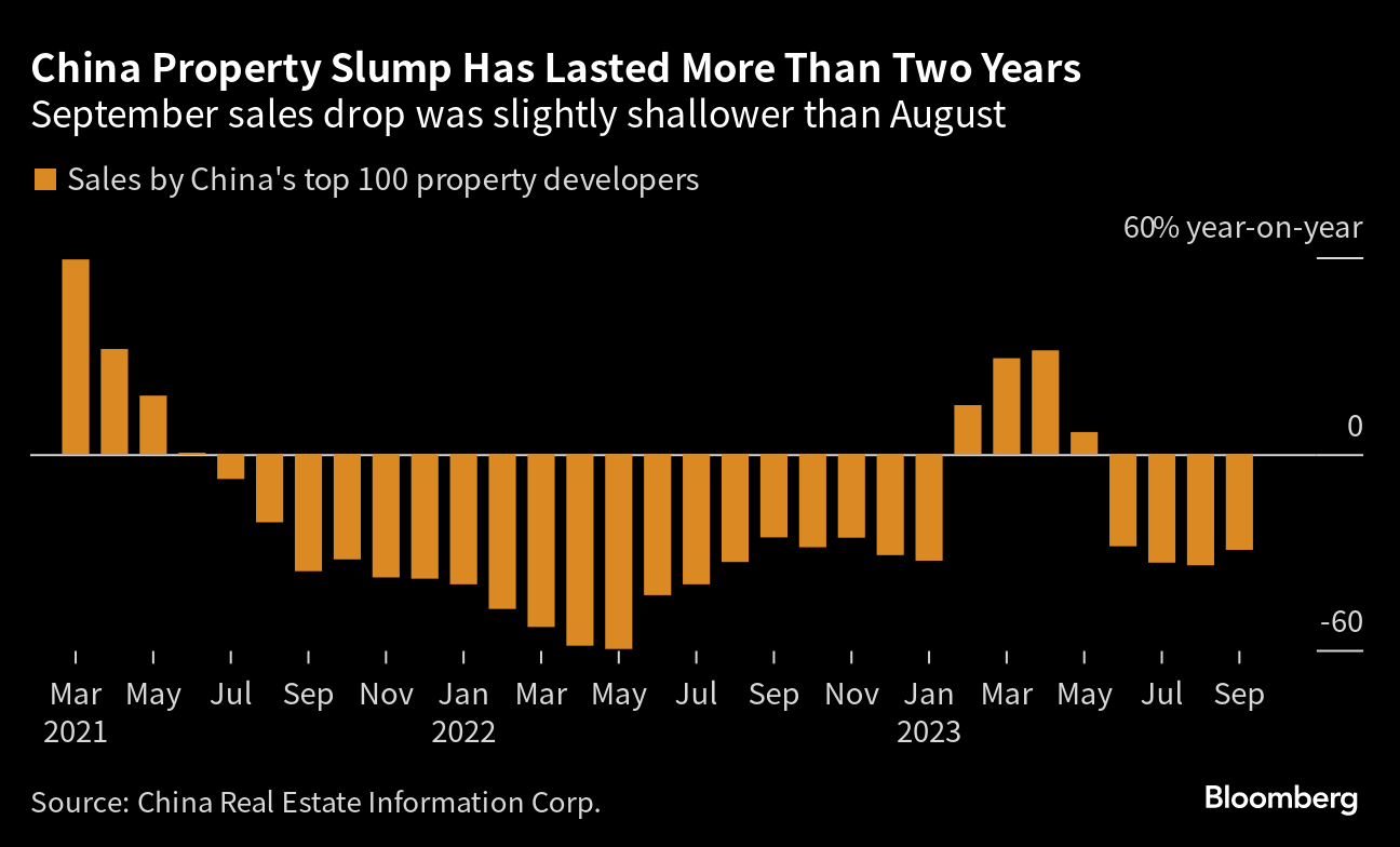 Some economists see a likelihood that the government will need to step up support, particularly for the property sector. The value of new home sales by China's top 100 developers fell 29% on-year in September, according to China Real Estate Information Corp, improving only slightly from the previous month's 34% drop.
