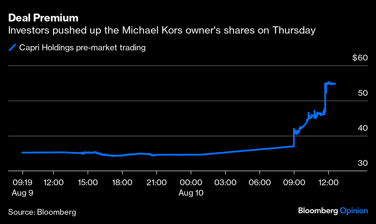 Tapestry is offering $57 per share in cash for Capri, a 65% premium to Wednesday's closing price. Although Capri stock has slumped nearly 50% since February, when the company cut its outlook for the year, that may not be enough to win over investors. The shares were trading as high as about $68 before the warning. Meanwhile, at the proposed valuation, the acquisition multiple is 9 times trailing earnings before interest, tax, depreciation and amortization, well below the about 16 times implied by Kering's recent purchase of a 30% stake in Valentino. Capri shares rose almost 60% to about $55 in pre-market trading.