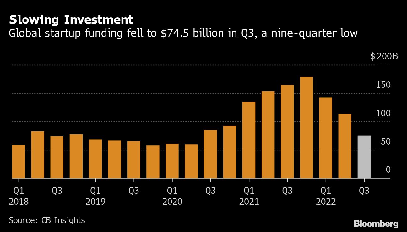 Now the startup ecosystem is facing headwinds. Global venture funding slumped to $74.5 billion in the past three months, its lowest level in nine quarters, according to CB Insights. That represents a 34% quarterly drop, the biggest in a decade.