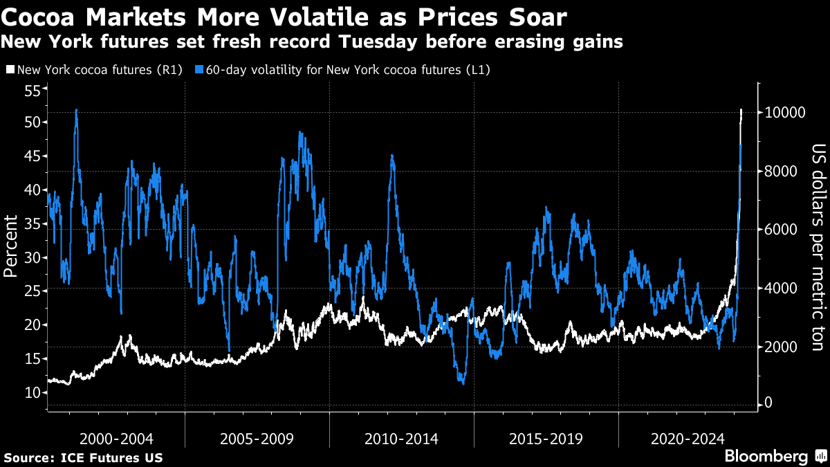 The most-active contract in New York fell as much as 2.5%, erasing earlier gains to an intraday record of $10,324 a metric ton. Cocoa prices have more than doubled this year on lower West African production. Recently, the market has become more choppy, with a 60-day measure of volatility at its highest in about 15 years.