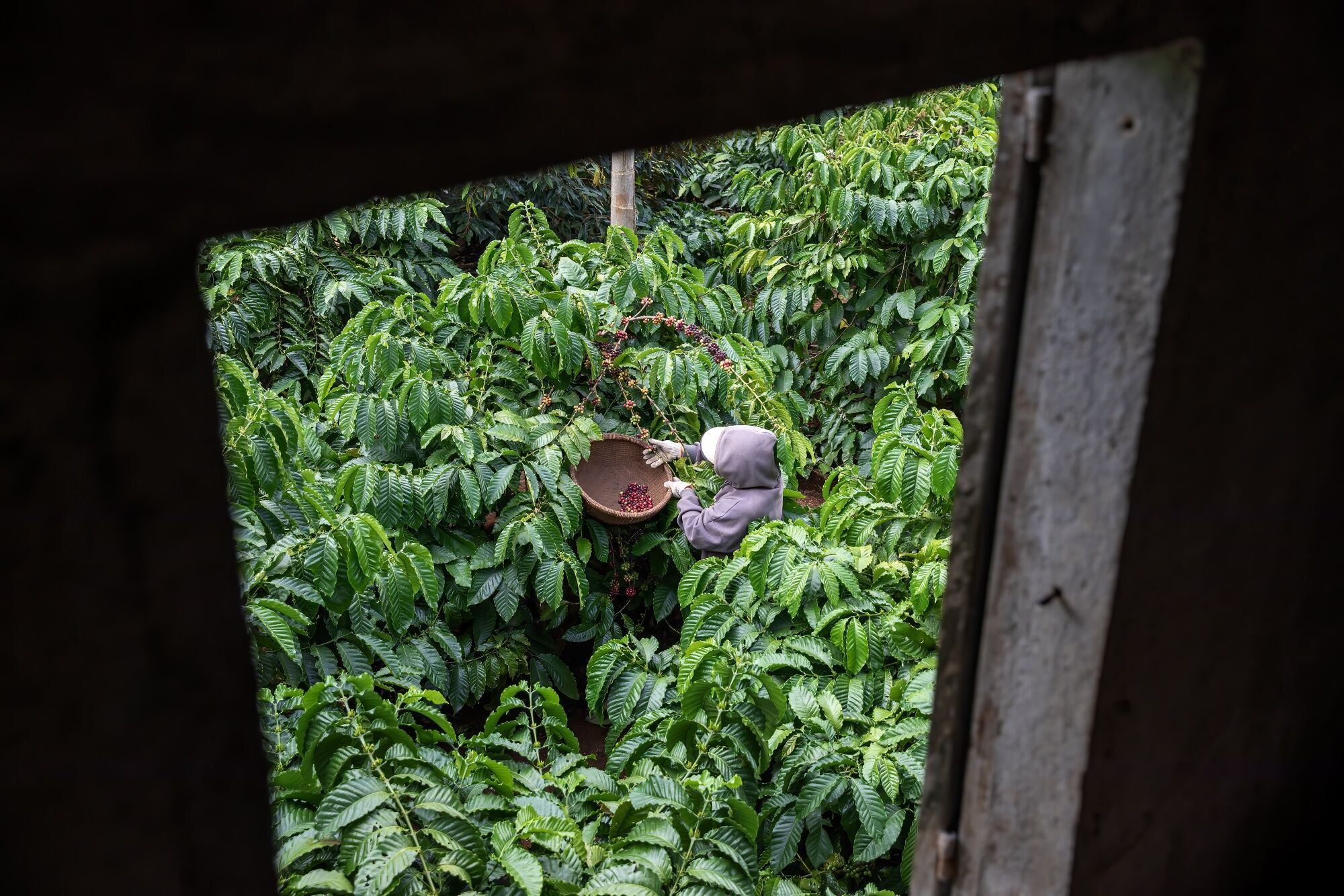 A worker harvests coffee cherries at a farm in Buon Ma Thuot, Dak Lak, Vietnam, in November.
