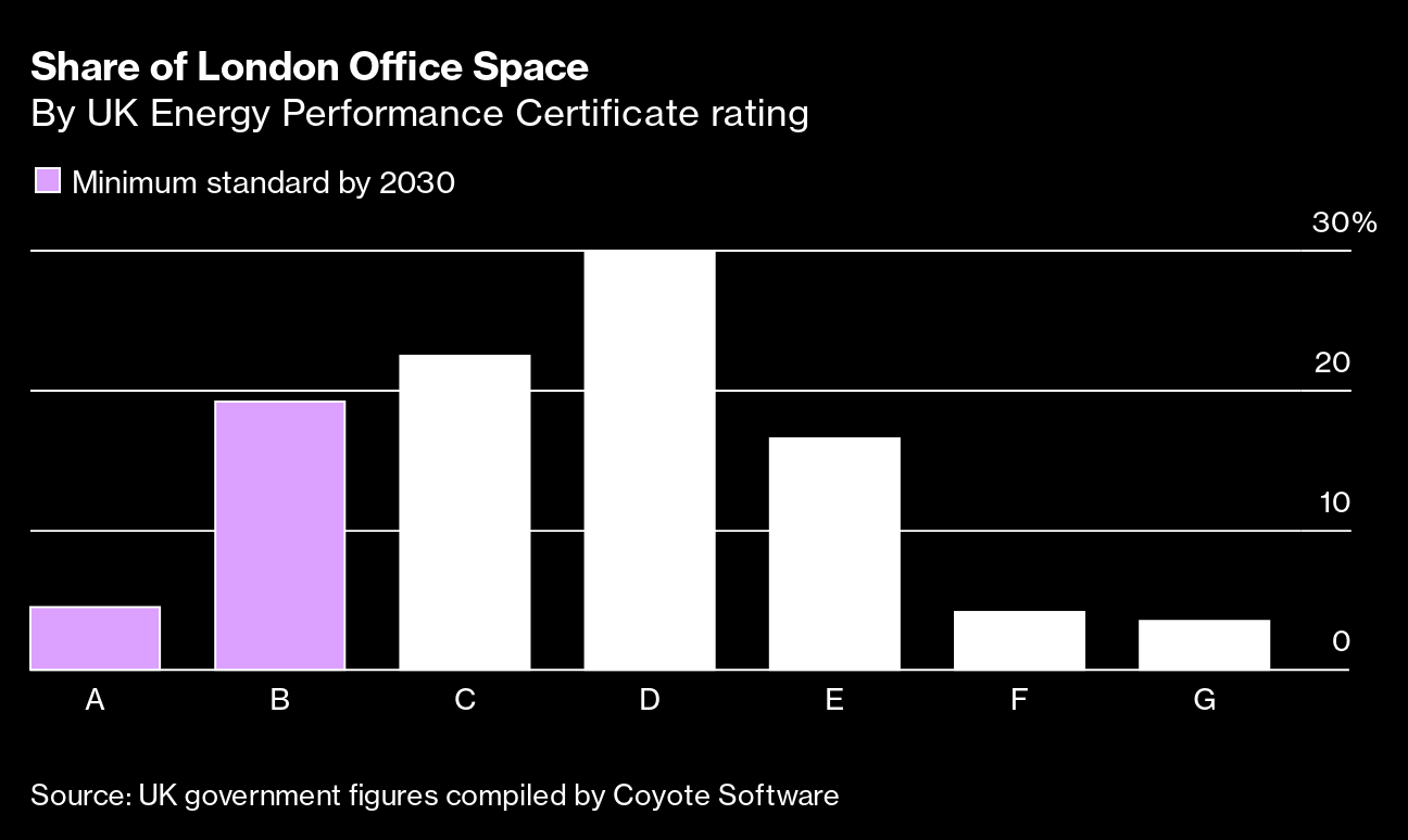 Another issue looming over London's real estate market is the prospect that hundreds of buildings will be rendered obsolete because they don't meet UK environmental regulations. Properties are graded on energy performance, from A to G. By 2030 it will be illegal to rent commercial buildings that are ranked below B. That leaves landlords forced to make costly upgrades or risk offices sitting empty. Brexit has also contributed to London losing some of its financial allure, says PGIM's Hayes. Office buildings are “very, very vulnerable for the near term,” he says.