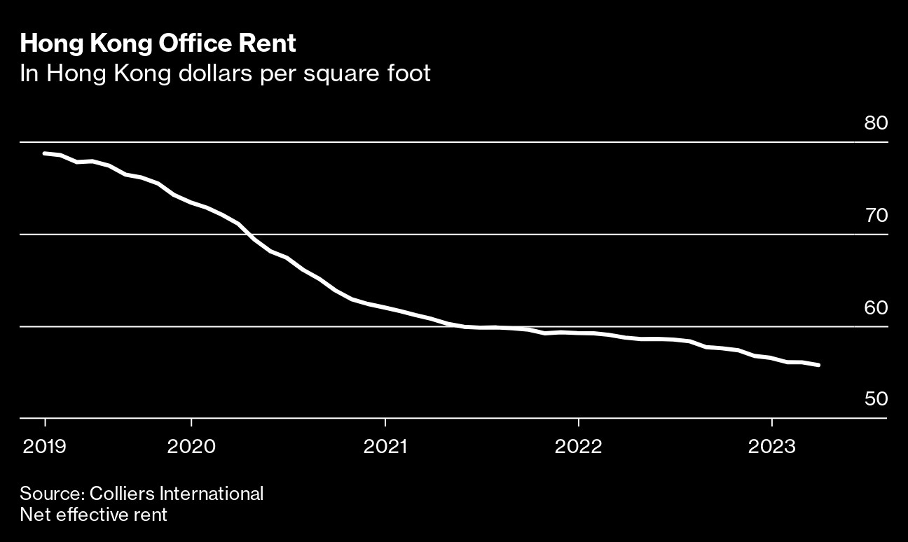 Across the city, cost-conscious foreign banks and Chinese companies are no longer taking up space at a time when new supply is increasing. The vacancy rate for top-tier Hong Kong office buildings climbed to 15% in April, more than three times what it was in 2019, data from Colliers International Group Inc. show.
