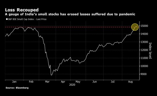 While stocks of all sizes have roared back from the depths of the pandemic selloff, the recovery in smaller Indian shares has been stronger. The S&P BSE Small Cap Index has surged 70 per cent from its March low and is now up 9.8 per cent for the year. In comparison, the benchmark Sensex has climbed about 50 per cent from its low and is still down 5 per cent in 2020.